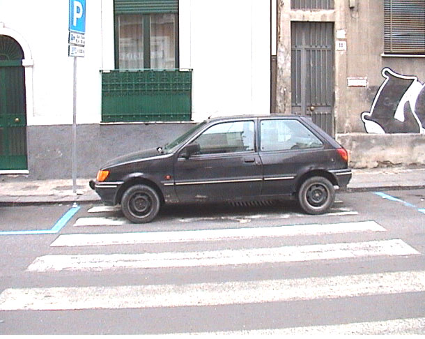 Oppure sulle Strisce pedonali con la Striscetta blu piazzata proprio di fronte la porta d'ingresso di una civile abitazione, ma stavolta è andata bene: se indovini il varco, entri. Foto come queste sarebbero innumerevoli e ripetitive. In un vicolo cieco del Centro storico, largo poco più di due metri, si sono contate sei auto parcheggiate, ma SpaventaPasserA ha avuto i poteri speciali giusto perché la Città è ad elevato rischio sismico. Mah, speriamo che il Padreterno alle lunghe non si incazzi.
